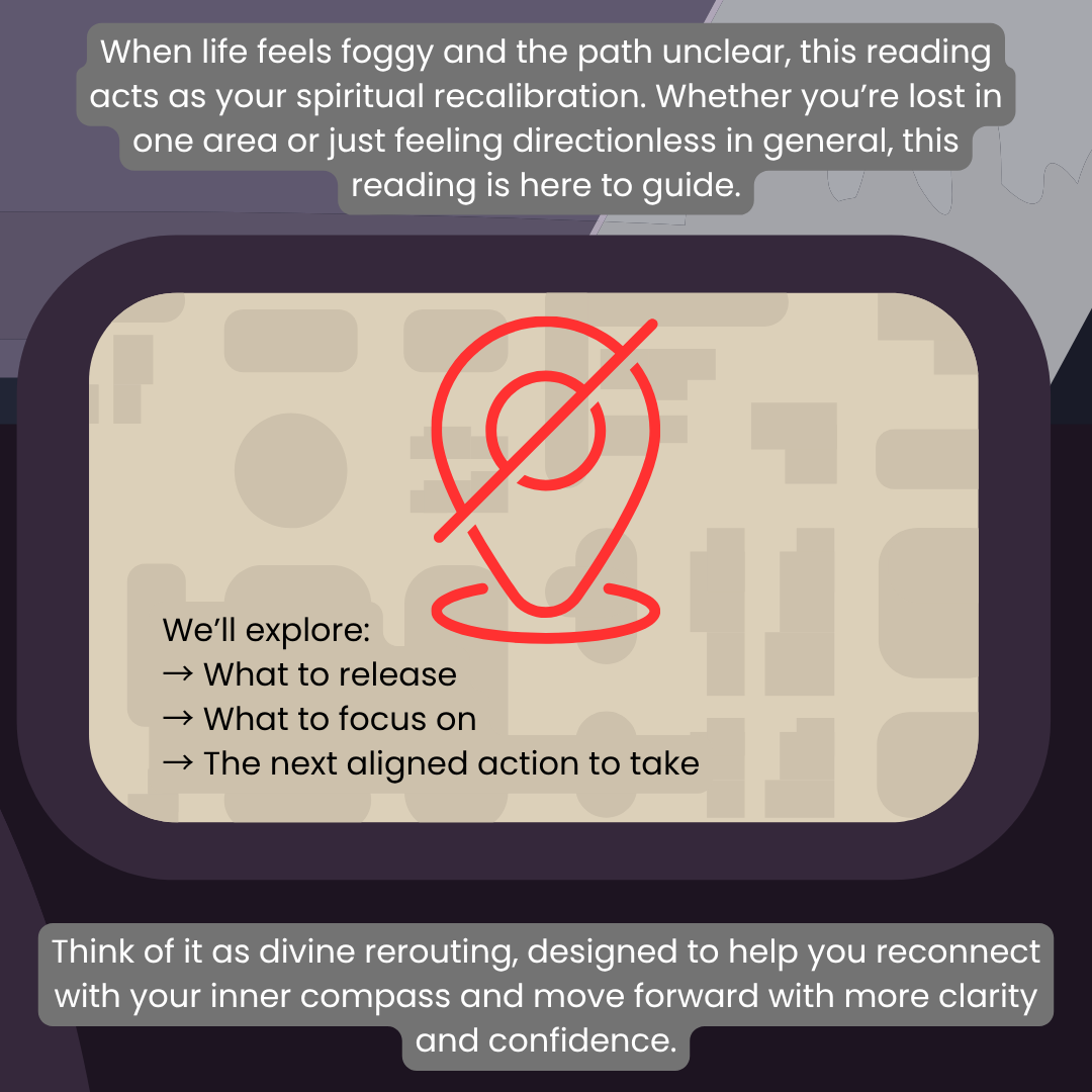 When life feels foggy and the path unclear, this reading acts as your spiritual recalibration. Whether you’re lost in one area or just feeling directionless in general, this reading is here to guide.