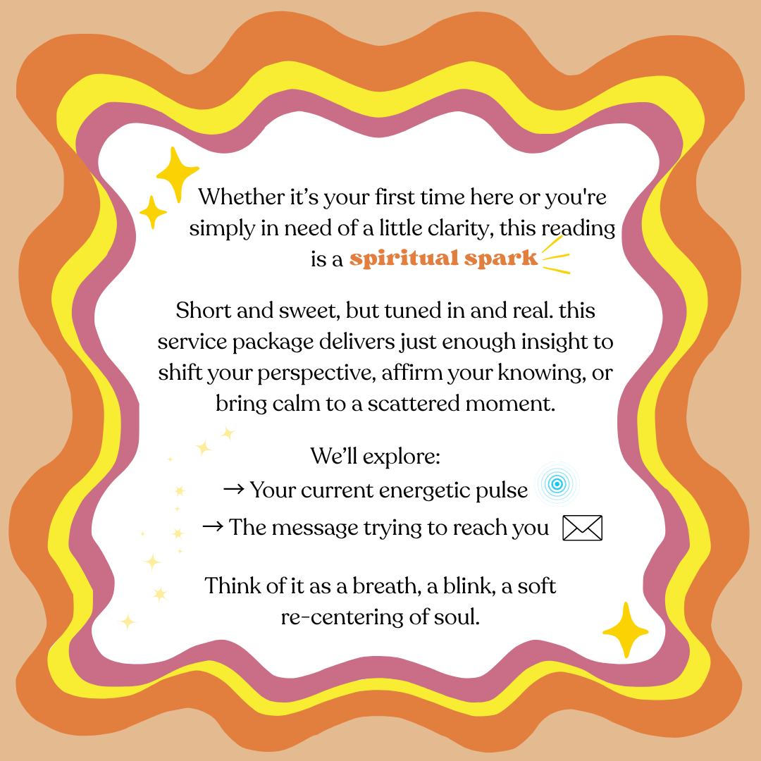 Short and sweet, but tuned in and real. this service package delivers just enough insight to shift your perspective, affirm your knowing, or bring calm to a scattered moment.